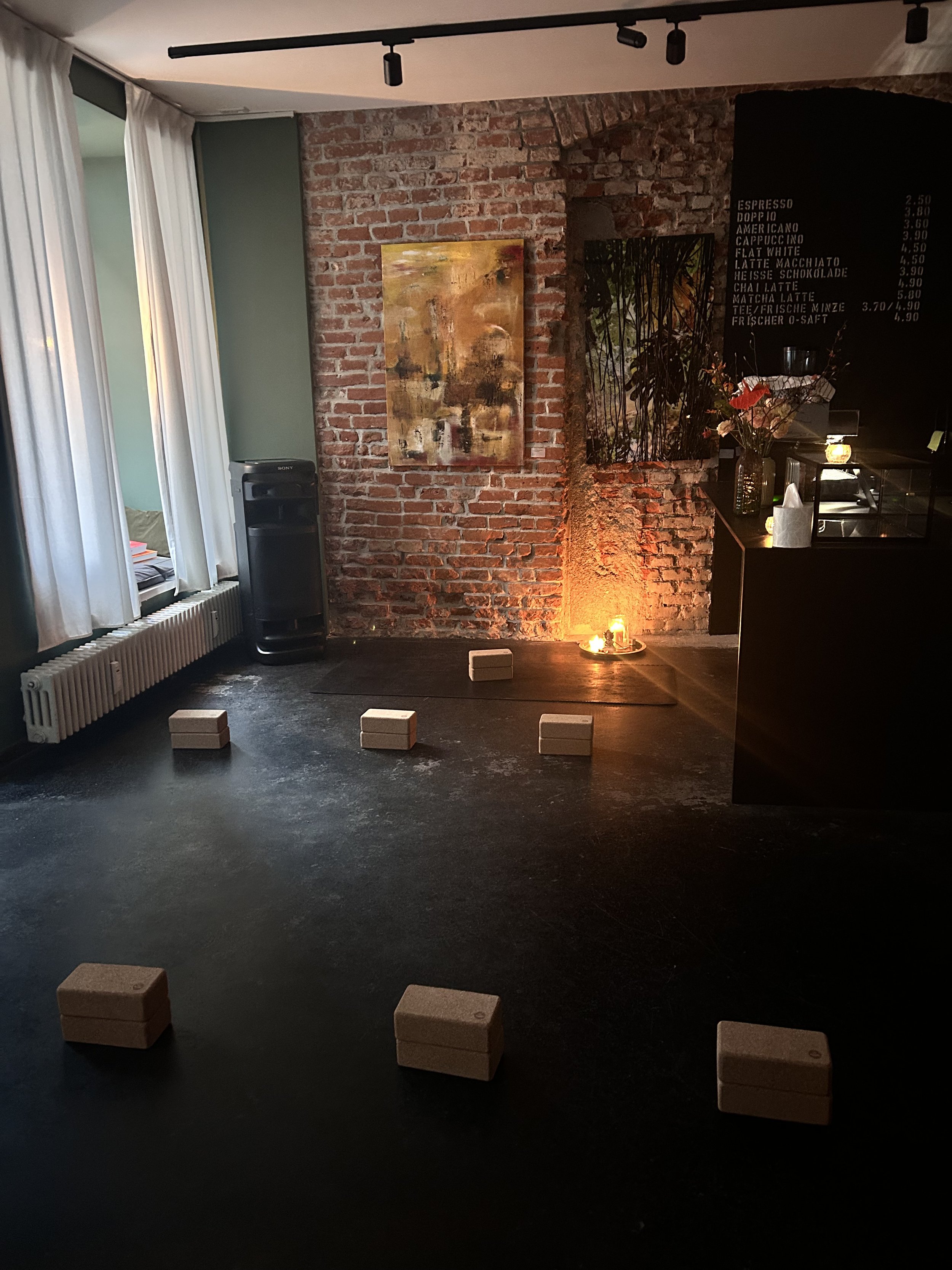 Jeden Montag und Dienstag biete ich hier im Studio Cafe in der Fürstenstraße mitten in der Münchner Maxvorstadt Yogaklassen an.